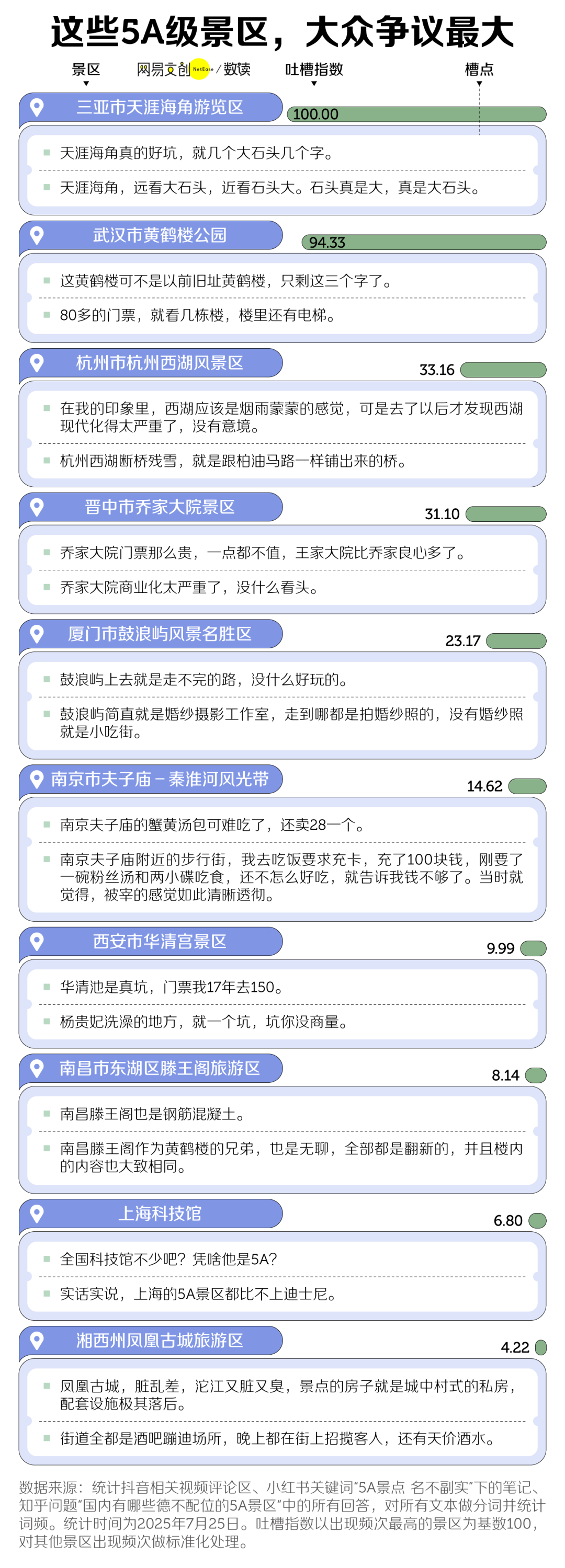 我们统计了社交媒体上最饱受争议的5A景区,发现2024年新入选的天涯海角和2007年第一批入选的黄鹤楼两大景区,“断崖式”地承担了最猛的火力。游客们最大的哀叹,当属被欺骗了感情。