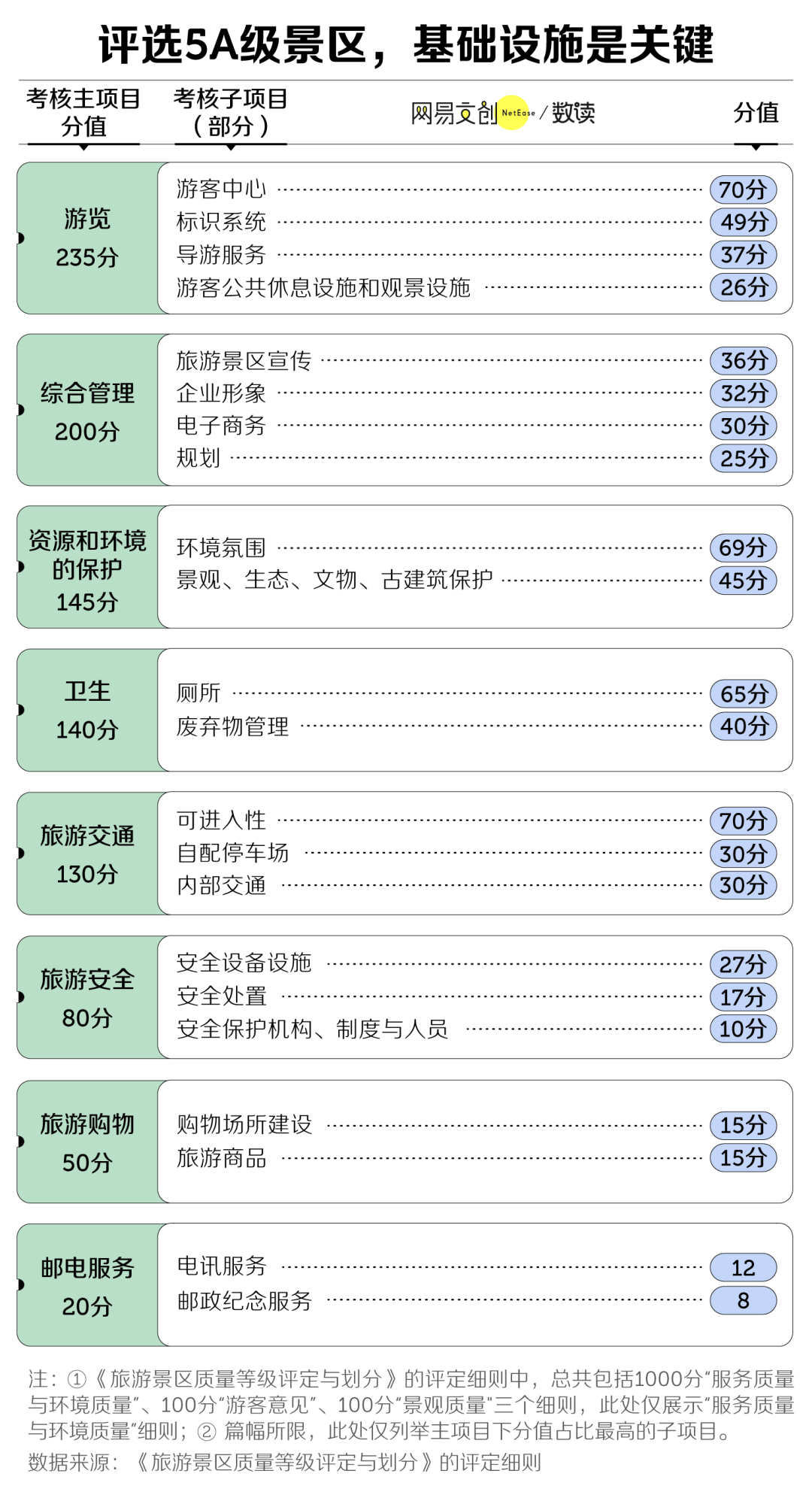 在1000分中,厕所干不干净、有没有游客中心、建筑美不美观,是最重头的压轴题。紧随其后的还有停车场、标识系统、导游服务等标配题目。