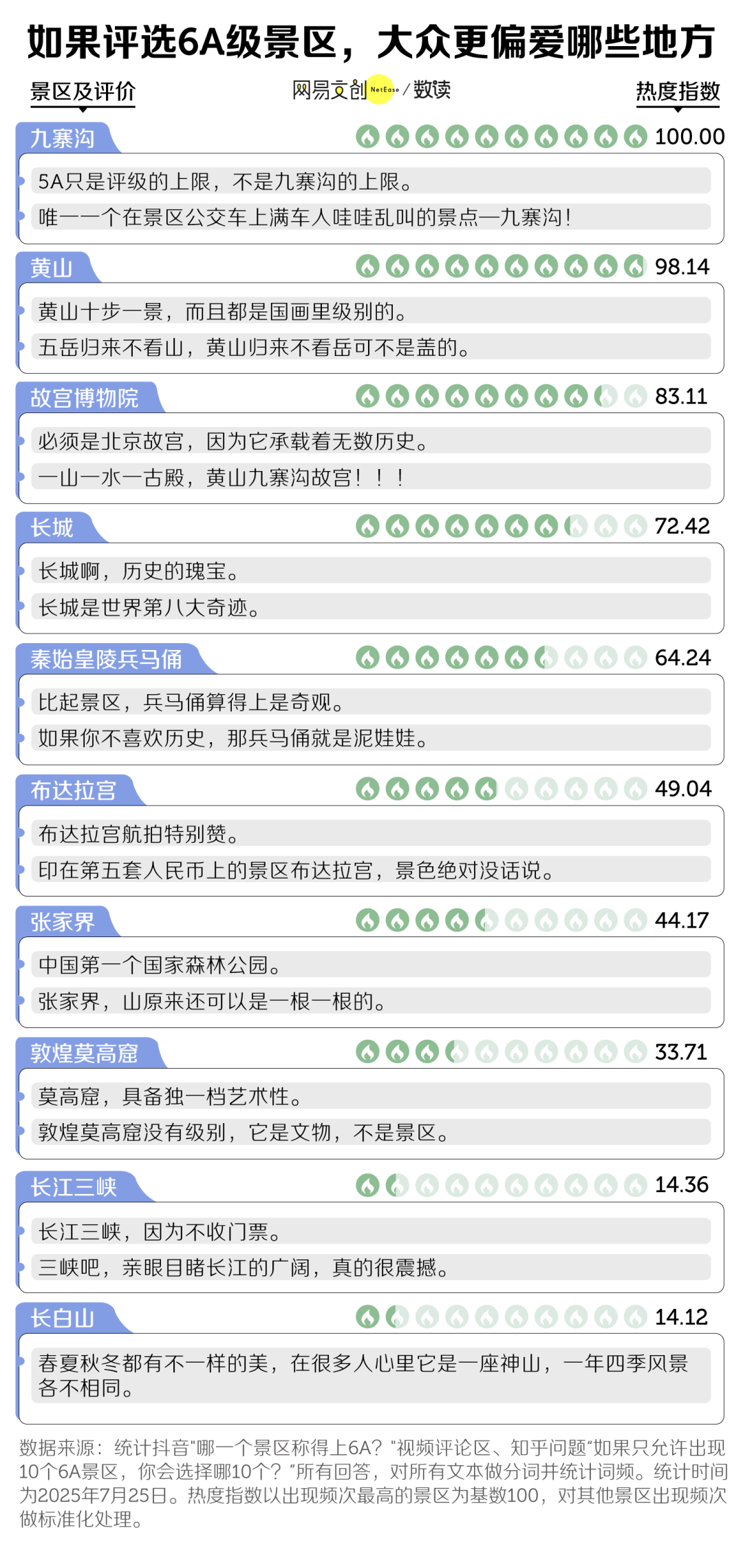 网友提名的6A级,人文类景区和自然类景区平分天下。“九寨归来不看水,黄山归来不看岳”的共识,最先进入人们脑海中。紧随其后的故宫、长城、兵马俑,也能靠着历史地位牢牢站稳。